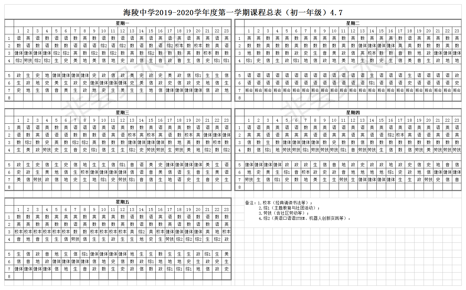 海陵中学2019-2020学年度第一学期课程总表(初一年级)