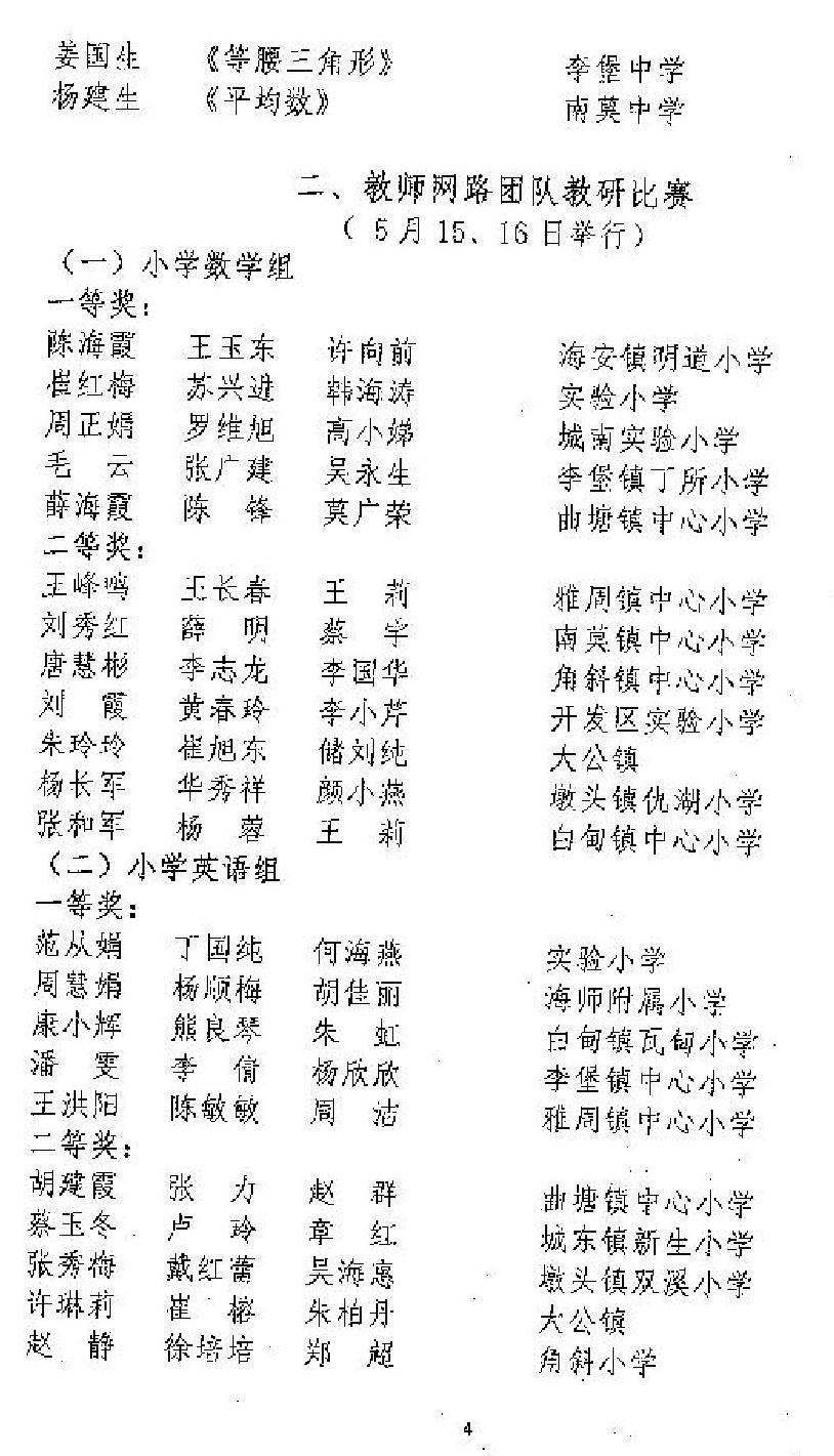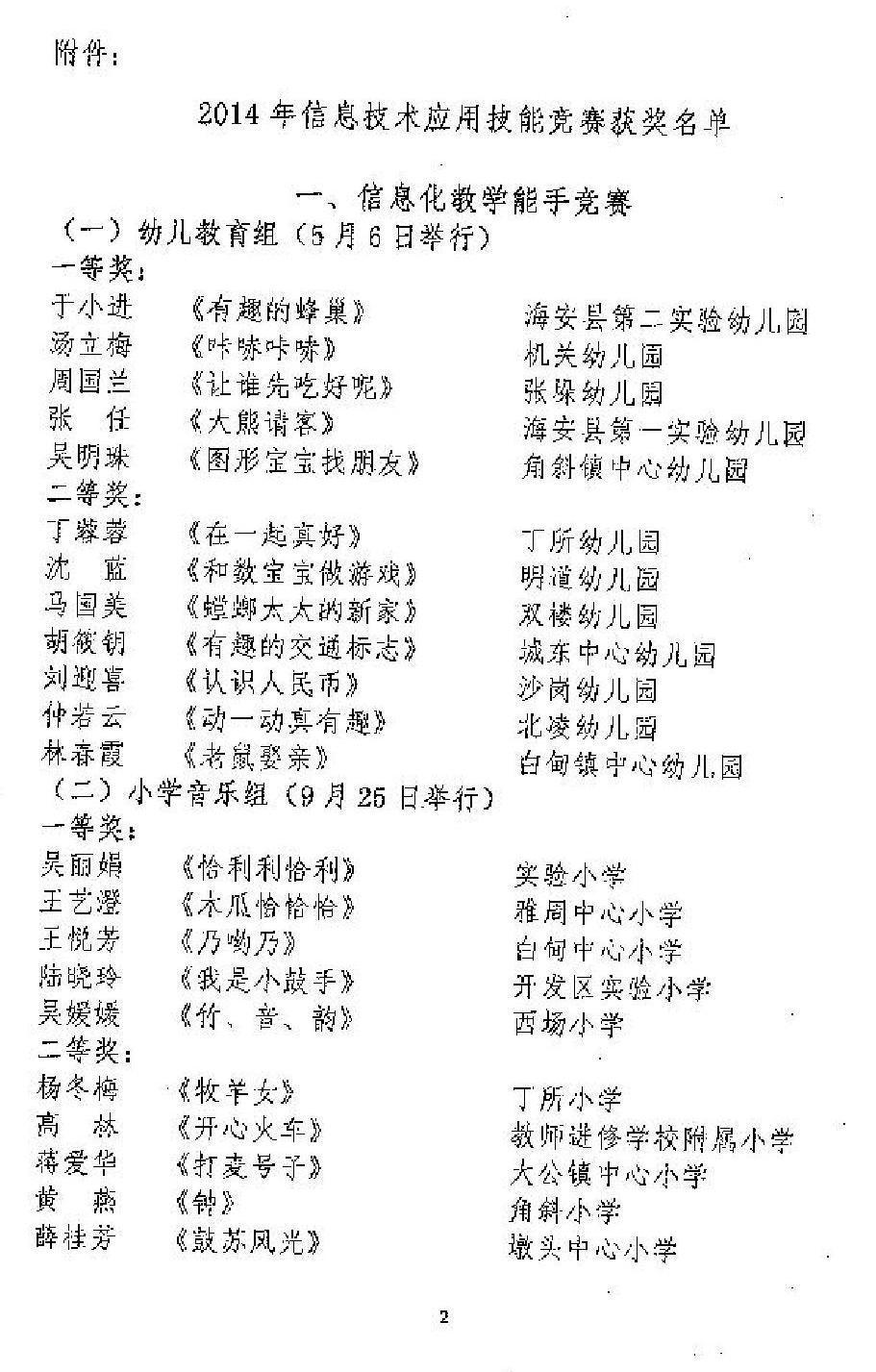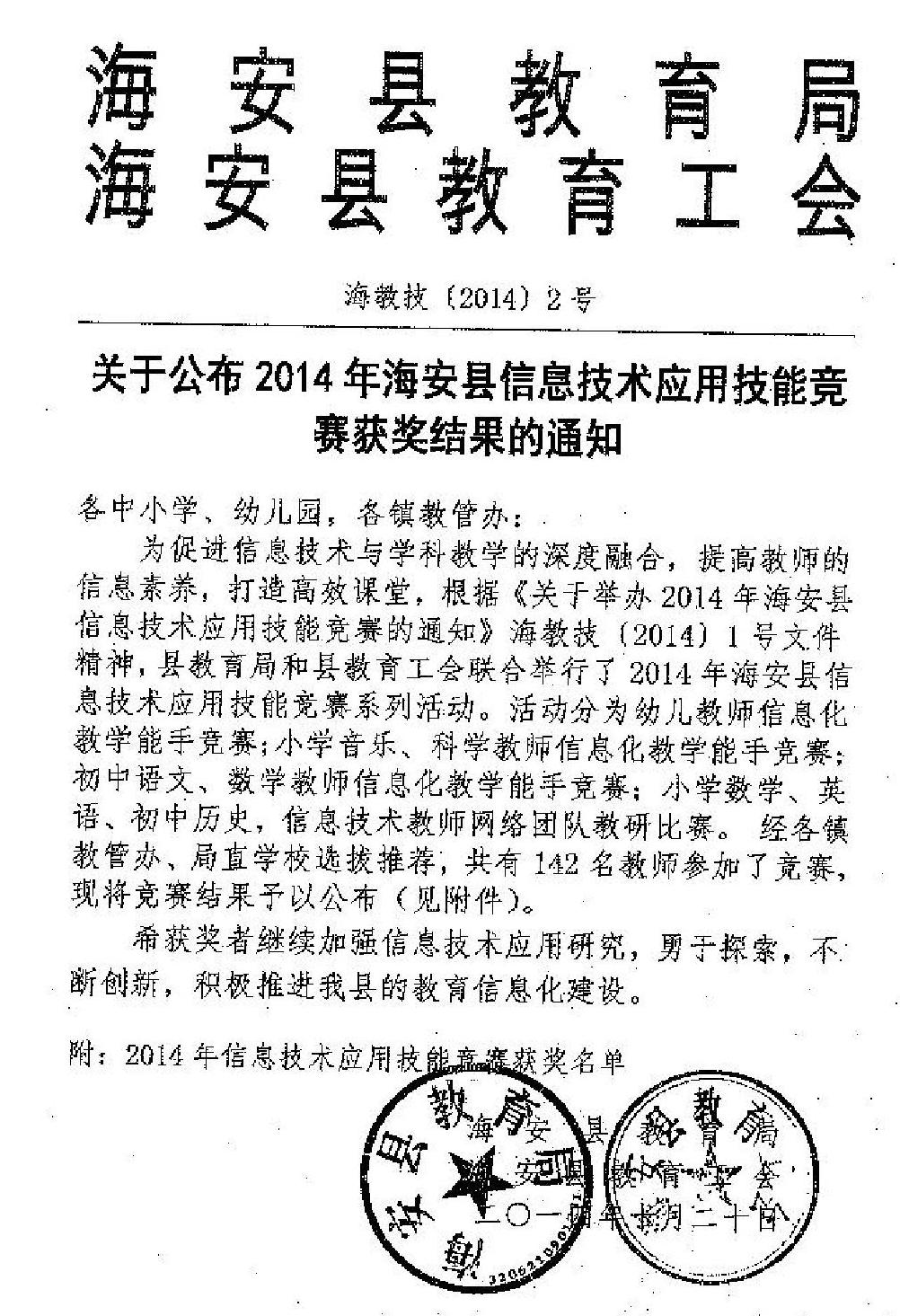 关于公布2014年海安县信息技术应用技能竞赛获奖结果的通知
