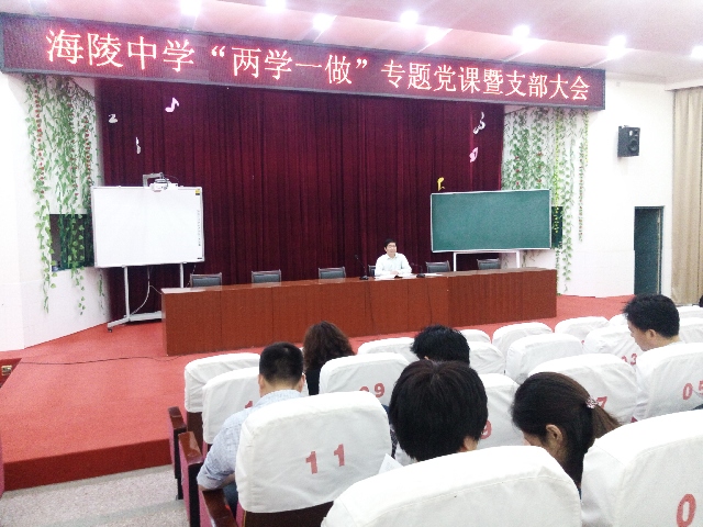 5月26日下午,教育局党委海陵中学党支部在学校三楼多功能厅召开了“两学一做”专题党课暨支部大会,会议由海陵中学党支部书记、校长田玉龙主持,支部全体党员参加了会议。会议有四项流程: