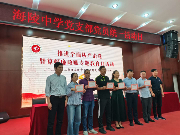 9月27日下午,海陵中学党支部在三楼多功能厅开展了“全面从严治党暨算好廉政账专题教育月”活动,海陵中学全体党员、中层以上干部、监委会成员参加会议,会议由副校长严安主持。