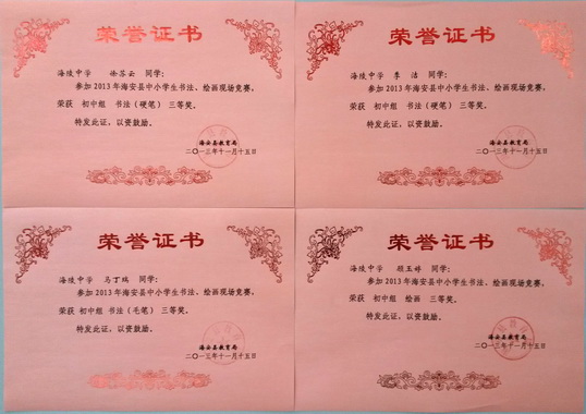 初一(5)班杭于笑、初一(10)班梅雪纯获书法(毛笔)二等奖,初二(18)班顾月龙、初二(13)班周雨豪获书法(硬笔)二等奖,初二(14)班刘诗羽、初二(18)班徐葭露获绘画二等奖。