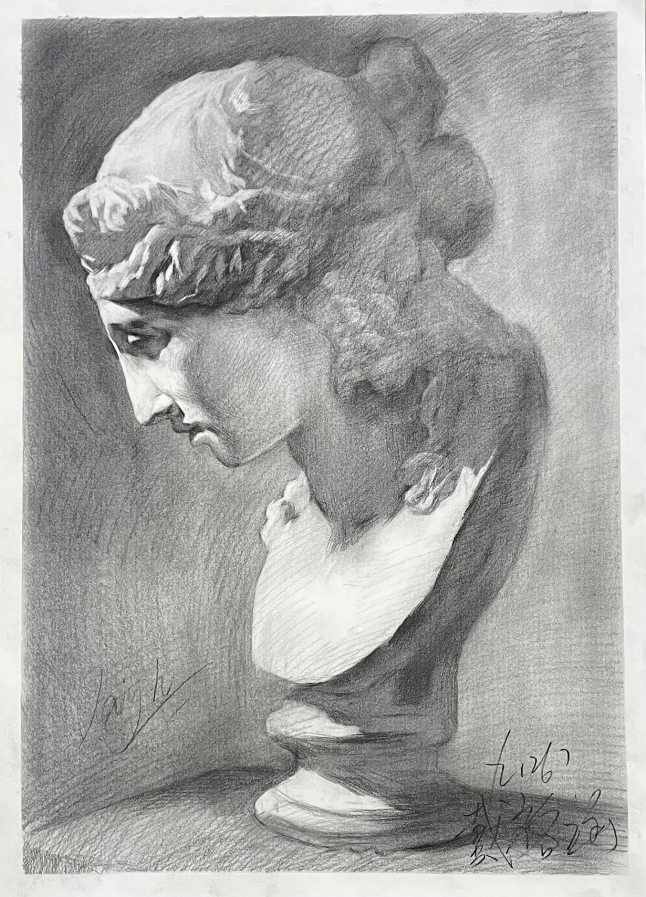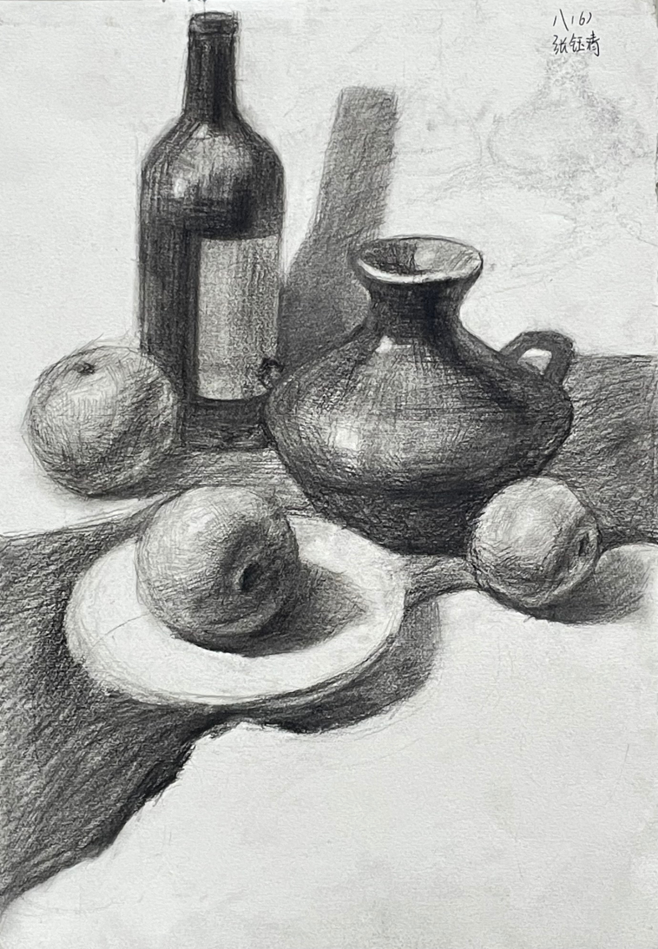 小艺术家们在作品中表达了对生活的关注和审美的学习。“朝辞白帝彩云间,千里江陵一日还。”有的作品描绘了晨起的江边,用笔触捕捉了早晨第一缕阳光照在江面上的温柔;有的则通过细致的画面展现了“草长莺飞二月天,拂堤杨柳醉春烟”的春日景致,黑白的素描作品更有一份内敛的灵动。