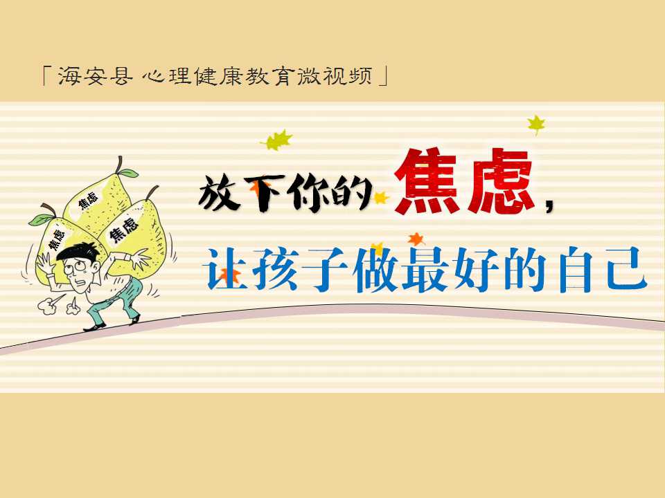 海教中2016【47】号文,我校报送的微视频作品《放下你的焦虑,让孩子做最好的自己》获2016年海安心理健康教育微视频评比特等奖。另,心理健康教育微型课题《家长心理焦虑调适》获优秀奖(未设等级奖)。以下为部分视频截图。