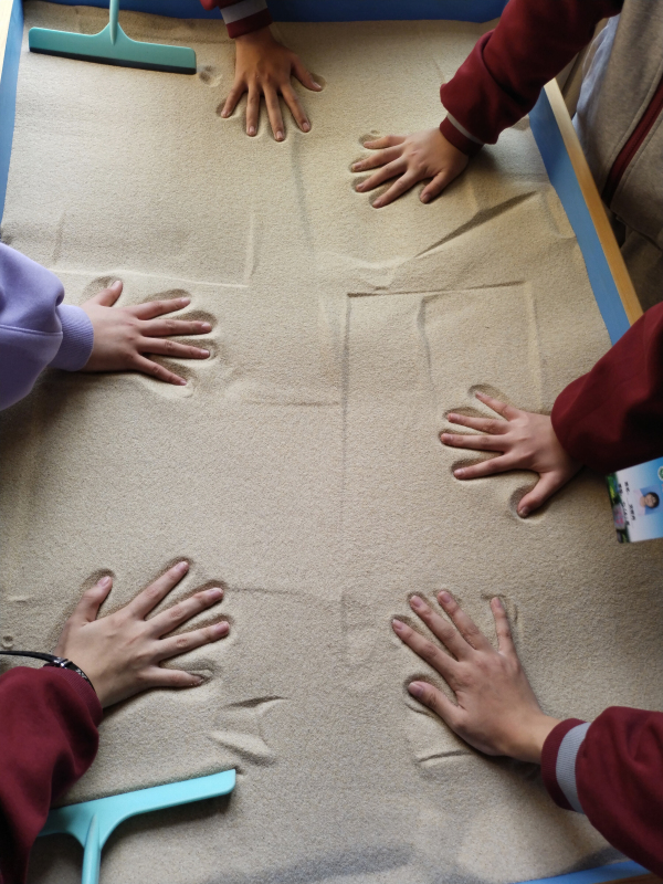 最后大家共同分享了摆放沙盘时内心的愿望和感悟,在相互汲取智慧中,每个人与沙具的连接进一步加深,也让每个人的美好愿景成倍的放大。沙盘虽小,但承载的确是我们心中最美的画面。活动结束,同学们将沙盘上的沙具归还原处,并留下自己的手掌印,共同纪念这美好的一刻。