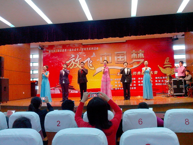 2013年10月27日下午,由县文明办、县委宣传部、县教育局、县团委、县妇联、图书馆等九家单位组织的新华杯·第八届未成年人读书节系列活动——“放飞中国梦·未成年人经典诵读”,在苏中七战七捷纪念馆报告厅举行,中学组共有二十三支代表队参赛,我校郁丁旸、曹牧野、张智、梅天航、虞清清、曹思洁六位同学的《青春中国 放飞梦想》的经典诵读荣获一等奖。
