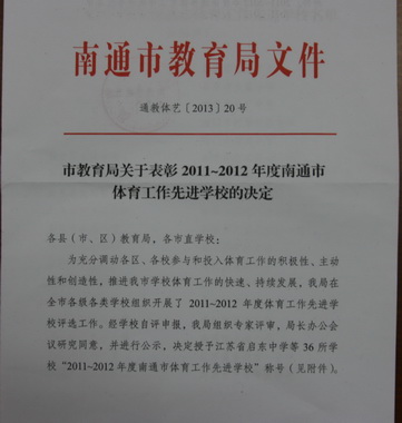 根据南通市教育局文件【通教体艺[2013]20号】《市教育局关于表彰2011~2012年度南通市体育工作先进学校的决定》,授予我校“2011~2012年度南通市体育工作先进学校”称号。