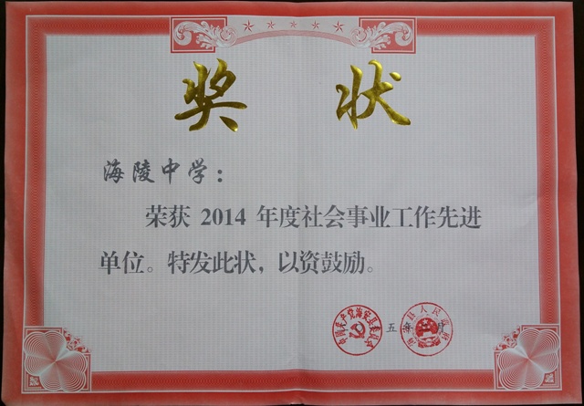 我校荣获2014年度社会事业工作先进单位 发布时间:2015-03-02 00:00:00 浏览次数: 次 我校在2014年社会事业工作中成绩显著,被海安县人民政府授予“2014年社会事业工作先进单位”。 分享到: 【打印正文】