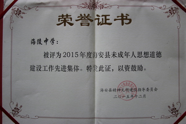 我校被评为2015年度海安县未成年人思想道德建设先进集体