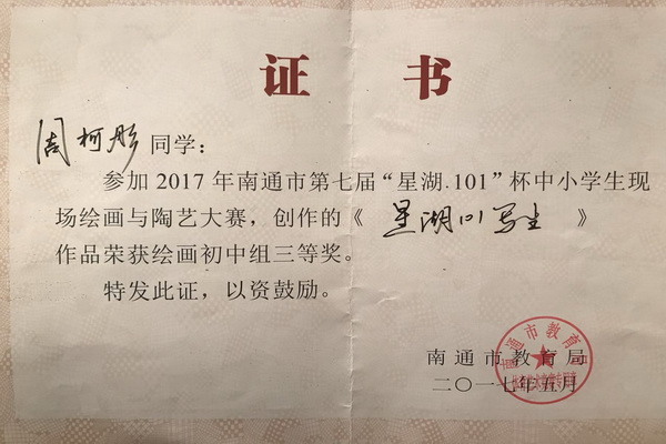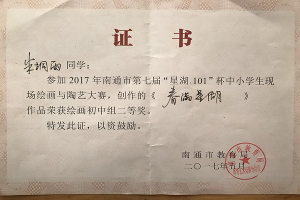 由南通市教育局主办,南通市教育科学研究院、南通经济技术开发区社会事业局承办的南通市第七届“星湖·101”杯中小学生现场绘画与陶艺大赛于05月13日在开发区星湖101广场举行。比赛分小学低段组、小学中段组、小学高段组、初中组四个学段级别。比赛内容分为陶艺和绘画。海陵中学4名参赛选手获奖:戴菁德写生作品《星湖101风景》及朱桐雨的国画创作《春满星湖》获绘画初中组二等奖,王启翔的风景写生《广场一瞥》和周柯彤的《星湖101写生》获绘画初中组三等奖。