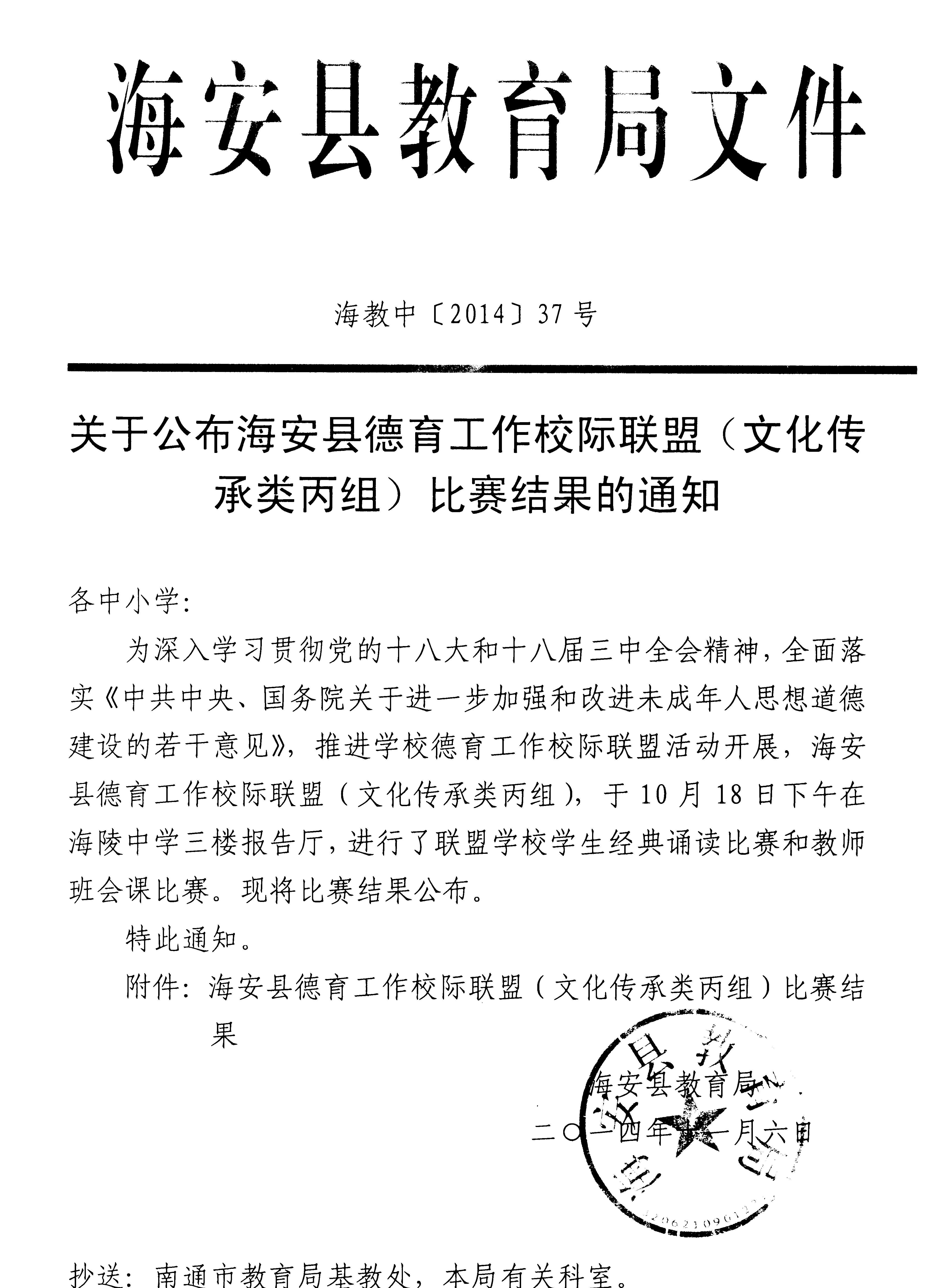 关于公布海安县德育工作校际联盟(文化传承类丙组)比赛结果的通知