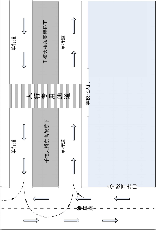 4.乘私家车(含摩托车)的学生的通行:(1)在学校北大门口送孩子上学的机动车辆,在规定道路靠右停靠。从右侧下车,引桥北侧“西行单行道”下车的学生一定要从引桥下“人行道专用通道”通行到达学校。学生下车后,东行车辆继续前行至镇南路口自行分流,西行车辆继续前行至钟庄路口自行分流。(2)在学校北大门口接孩子放学的机动车辆,应按交通规则有序停放车辆,不得在网格线内停放车辆。(3)经钟庄路南北向通行接送的机动车辆一律在学校的西大门口有序停靠。接送时,车辆一律靠右停靠,从车辆右侧上下车。接送车辆不得在校门口掉头,确保道路畅通。(5)放学接孩子时,车辆靠边沿公路两边有序整齐排列,车头与回程方向一致。不得影响公交车通行。