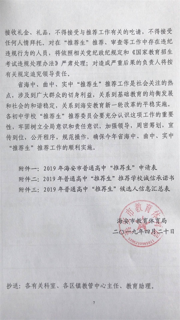 7.5月21日,省海中将经公示的“推荐生”名单报海安市教体局中教科审核备案,同时告知推荐学校。省海中考核过程材料必须密封留存备查。