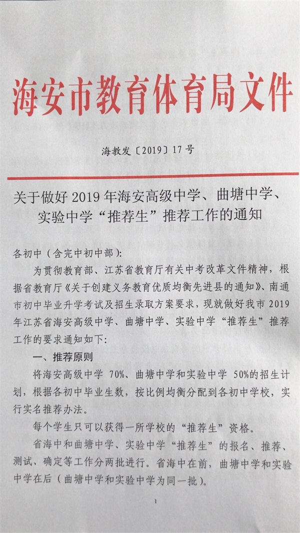 4.5月28日,曲塘中学、实验中学将经公示的“推荐生”名单报海安市教体局中教科审核备案,同时告知推荐学校。考核过程材料必须密封留存备查。
